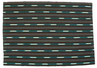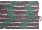 DescriptionWoman’s headtie woven on a man’s horizontal loom in strips of approximately 3.75” wide; seven strips are stitched together edge to edge to form this headtie. Primarily maroon with black and white stripes and dark green supplementary weft designs. Narrowband cloth is known locally as Aso-oke; this example is of the type known as Aso-oke Alari, and includes small openwork holes. Unhemmed.